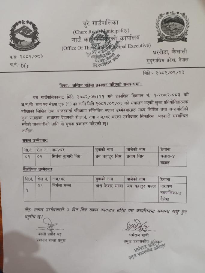 अ. न. मि. पदको अन्तिम नतिजा प्रकाशन गरिएको सम्बन्धमा ।
