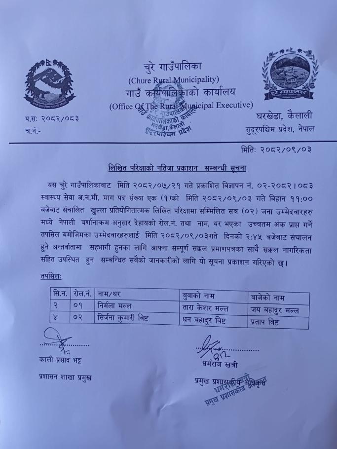 अ. न. मि. पदको अन्तिम नतिजा प्रकाशन गरिएको सम्बन्धमा ।