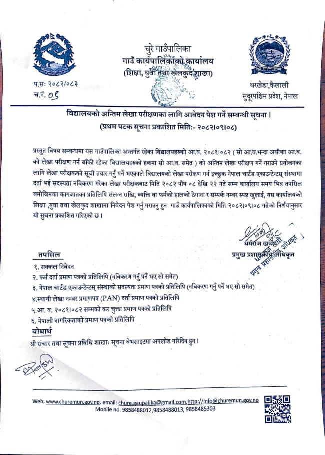 विद्यालयको अन्तिम लेखापरिक्षणका लागि आवेदन पेश गर्ने सम्बन्धी सूचना ।