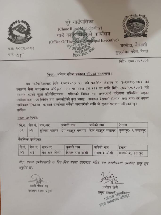 जनस्वास्थ्य अधिकृत पदको अन्तिम नतिजा प्रकाशन गरिएको सम्बन्धमा ।