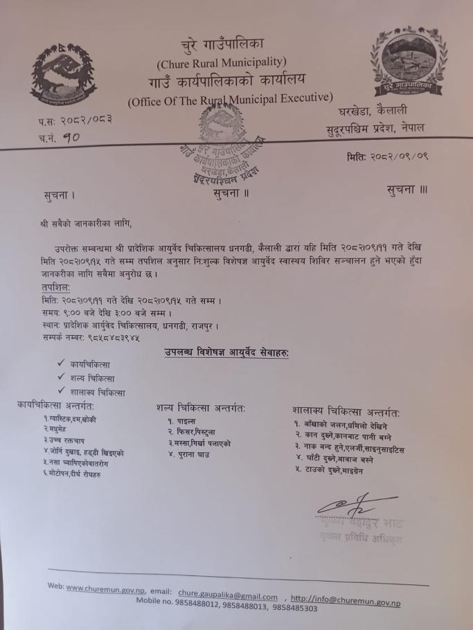 » नि:शुल्क विशेषक्ष आयुर्वेद स्वास्थ्य शिविर संचालन हुने सम्बन्धी सूचना ।