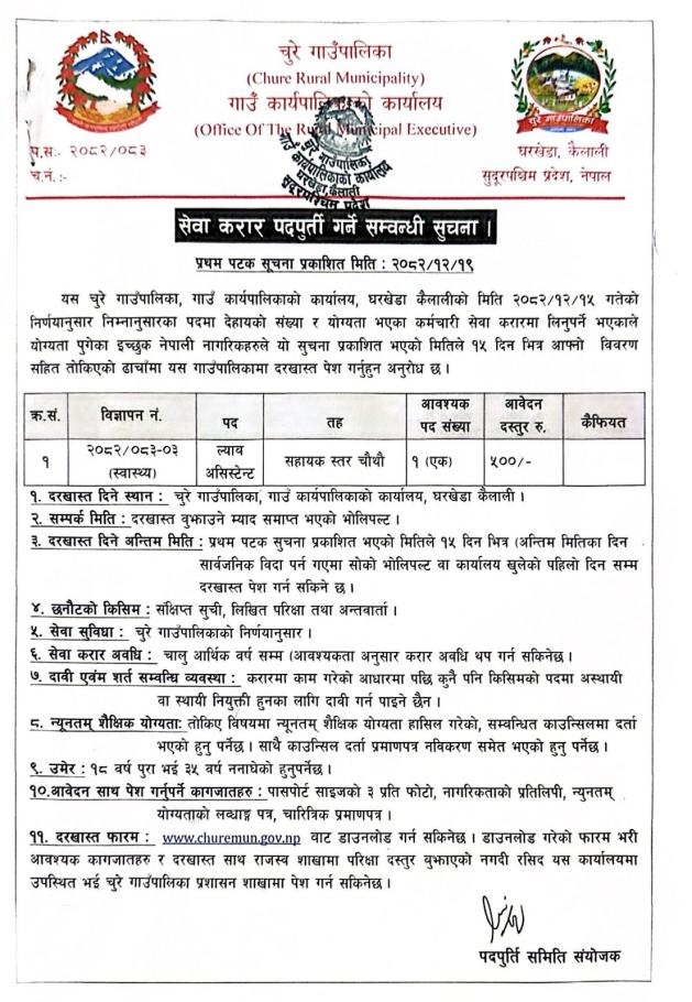 ल्याव असिस्टेन्ट पदमा सेवा करार पदपुर्ती गर्ने सम्बन्धी सूचना (प्रथम पटक प्रकाशित मिति: २०८२।१२।१९ गते)