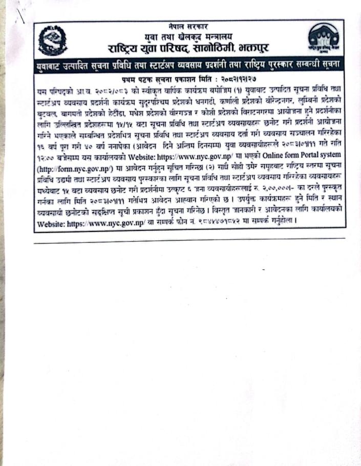 युवाबाट उत्पादित सुचना प्रविधि तथा स्टार्टअप व्यवसाय प्रदर्शनी तथा राष्ट्रिय पुरस्कार सम्बन्धी सूचना ।