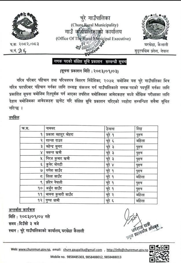 ज्यालादारीमा गणक पदपुर्तीको दरखास्त दिने समयावधी थप गरिएको सम्बन्धी सूचना । (दोश्रो पटक प्रकाशित मिति: २०८२।१२।२७)